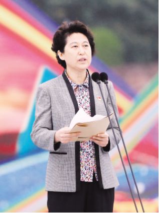河南省委常委、省委副書記、政法委書記,運動會組委會執(zhí)行主席喻紅秋致歡迎詞。 趙利 攝