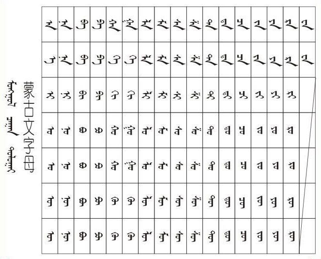 回鶻式蒙古文字是一種拼音文字。字母分元音和輔音兩大類,雖然至今人們尚未在文獻記載中發(fā)現(xiàn)其字母表,但據后人對這種文字材料進行分析,歸納出有19個字母。其中,5個表示元音,14個表示輔音。書寫時元音字母和輔音字母筆畫連在一起,形成一個整體蒙古字。每個字母視其出現(xiàn)在詞里的位置不同,寫法略有變化,分詞首、詞中、詞末3種變體。阿拼寫時一般以詞為單位,上下連書。字序從上到下,行序從左到右。因其是以回鶻文為基礎創(chuàng)建的,因此稱其為回鶻式蒙古文。