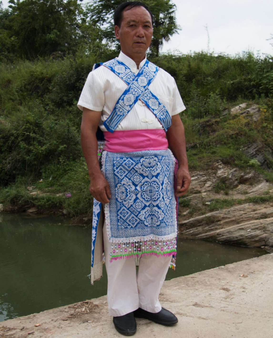 谷立村男子服飾相對(duì)于苗族女子服飾則顯得較為簡(jiǎn)樸,男子上身主要穿著白色打底的對(duì)襟衣,身后背有背牌,背牌底色為藍(lán)色,上繡有花朵圖案作為裝飾。下身主要以藍(lán)色打底的圍裙為主,身前圍裙,上面布滿(mǎn)刺繡圖案。身后的圍裙則為一條條獨(dú)立的絲帶,絲帶上同樣布滿(mǎn)花紋刺繡圖案,在其底部還串有珠簾作為裝飾。