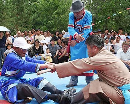 頸力賽和扳棍一樣,也是達斡爾族傳統(tǒng)的競技項目之一,在達斡爾族之間十分流行。頸力賽的比賽方式和扳棍相似,比賽雙方需要端坐在平地上,蹬直雙腿,腳掌相對,雙手叉腰或放在腿上,用布腰帶套在雙方脖頸后部。當裁判員聲響后,比賽雙方需要互相用脖頸力拉扯對方,哪一方被拉起或屈膝歪倒,就輸?shù)袅吮荣悺?/p>