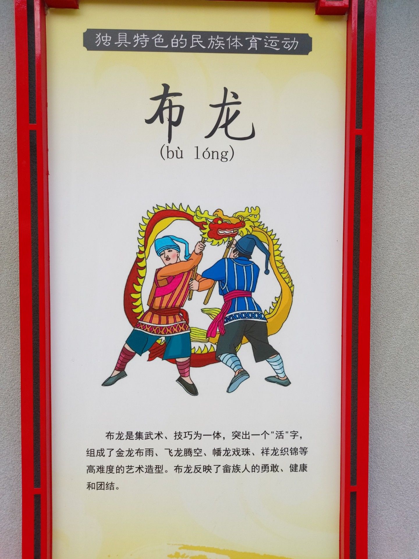 布龍是集武術、技巧為一體,突出一一個"活"字,組成了金龍布雨、飛龍騰空、幡龍戲珠、祥龍織錦等高難度的藝術造型。布龍反映了畬族人的勇敢、健康和團結。