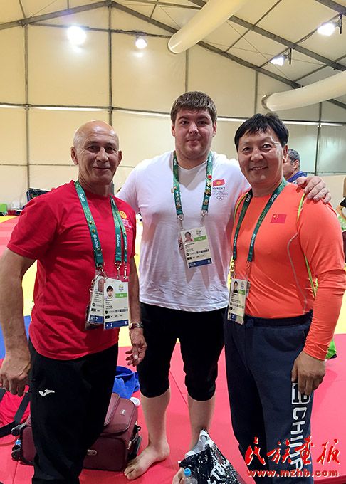 2016年,里約奧運(yùn)會期間,烏日根桑格(左)與中國國家柔道隊(duì)隊(duì)員于頌(中)、國家柔道隊(duì)原主教練程志山合影留念。