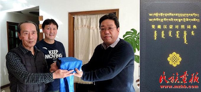 烏日根桑格(中)利用業(yè)余時(shí)間,與民族出版社蒙古文部原主任、資深編審卓日格圖先生(左一)合作出版《梵藏漢蒙對照詞典》。圖為向?qū)W者贈(zèng)閱該詞典。