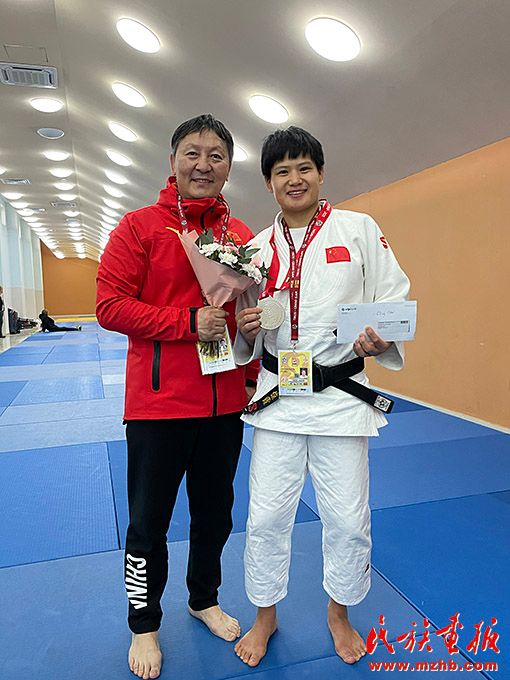 烏日根桑格(左)隨國家柔道隊(duì)參加 2021年世界柔道大滿貫比賽。圖為與國際級運(yùn)動(dòng)健將、國家柔道隊(duì)隊(duì)員楊俊霞合影留念。