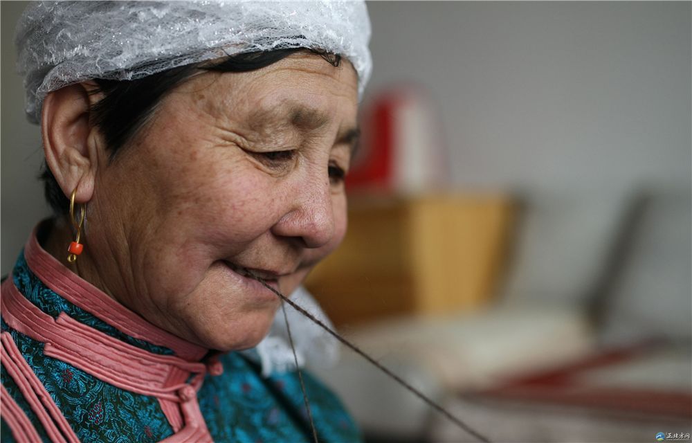 傳統(tǒng)氈繡不僅用于工藝品,大多用在生產(chǎn)生活中。蘇尼特氈繡技藝的繡制首先從制氈開始,大都在夏末秋初進行。材料多為駝絨線,而紡駝絨線則是用駱駝膝蓋絨毛以及駝鬣的細絨手搓而成。