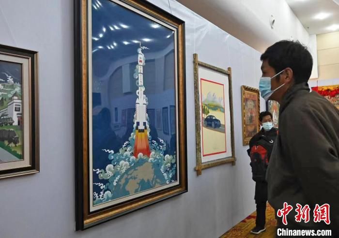 邊巴是作品《一飛沖天》的作者,這位畫師從1979年從事唐卡繪畫至今。他說(shuō),該作品以神舟十三號(hào)為主題,描繪了飛船沖出地球奔向星辰大海的瞬間。采用勉唐派唐卡繪畫語(yǔ)言和傳統(tǒng)礦植物顏料。同時(shí)融合了漢藏審美視角,立足于中國(guó)放眼世界的人類命運(yùn)共同體胸懷,嘗試新時(shí)代新唐卡新融合的藝術(shù)表達(dá)。