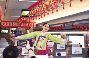 沈佳高鐵長白山至敦化段開通運營,將促進(jìn)沿線旅游業(yè)和冰雪經(jīng)濟(jì)快速發(fā)展,進(jìn)一步加強(qiáng)民族團(tuán)結(jié),助力長吉圖開發(fā)開放、深度融入 “一帶一路”。圖為列車工作人員在車內(nèi)表演朝鮮族歌舞。 新華社發(fā)