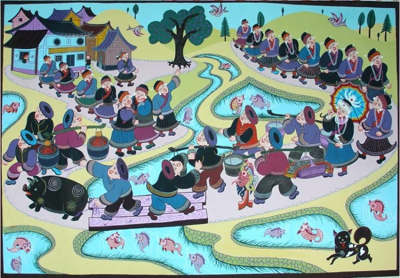 劍河現(xiàn)代民間繪畫源于傳統(tǒng)的苗族刺繡文化,是苗族刺繡文化的另一種表現(xiàn)形式和藝術(shù)升華。傳統(tǒng)的苗族文化多以服飾、歌舞為載體,并以刺繡及演唱等形式進(jìn)行表現(xiàn)和傳承。早期劍河現(xiàn)代民間畫即脫胎于具有適用性的苗族刺繡樣稿——剪紙和手繪刺繡粉本,換言之,手繪的苗族刺繡粉本便是劍河現(xiàn)代民間繪畫的雛形,劍河第一批優(yōu)秀的現(xiàn)代民間畫作者,即是原當(dāng)?shù)厥掷L粉本的能工巧匠。劍河現(xiàn)代民間繪畫多以苗族神話傳說中的故事情節(jié)和民俗節(jié)日、生產(chǎn)活動(dòng)等內(nèi)容為題材入畫,素材涵蓋自然界花鳥蟲魚及人物、家畜等具體形象,造型稚拙天真,設(shè)色濃艷,對(duì)比強(qiáng)烈。作品傳達(dá)出典型的地域民俗氣息及濃厚的鄉(xiāng)土味,便是其標(biāo)志性特征。