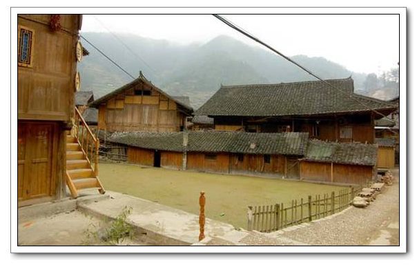 苗族山寨,村民居住的是吊腳樓。苗族大多居住在高寒山區(qū),山高坡陡,平整、開挖地基極不容易,加上天氣陰雨多變,潮濕多霧,磚屋底層地氣很重,不宜作息起居。因而,苗族山寨歷來依山抱水,能工巧匠用本地盛產(chǎn)的杉木,構(gòu)筑一種通風(fēng)性能好的干爽的木樓,叫“吊腳樓”。苗族的吊腳樓建在斜坡上,把地削成一個“廠”字形的土臺,土臺下用長木柱支撐,按土臺高度取其一段裝上穿枋和橫梁,與土臺平行。吊腳樓低的七、八米,高者十三、四米,占地八、九十個平方米。屋頂除少數(shù)用杉木皮蓋之外,大多蓋青瓦,平順嚴密,大方整齊。吊腳樓一般以四排三至五間為一幢,有的除了正房外,外延還搭了一兩個“偏廈”。每排木柱一般9根,即五柱四瓜。每幢木樓,一般分三層,上層儲谷,中層住人,下層樓腳圍欄成圈,作堆放雜物或關(guān)養(yǎng)牲畜等。住人的一層,旁有木梯與樓上層和下層相接,該層設(shè)有走廊通道,約1米寬。堂屋是迎客間,兩側(cè)各間則隔為二三小間為臥室或廚房。房間寬敞明亮,門窗左右對稱。有的苗家還在側(cè)間設(shè)有火坑,冬天就在這燒火取暖。中堂前有大門,門是兩扇,兩邊各有一窗。中堂的前檐下,都裝有靠背欄桿,俗稱“美人靠”。大多數(shù)吊腳樓在二樓地基外架上懸空的走廊,作為進大門的通道。堂屋外的懸空走廊,安裝有獨特的s形曲欄靠椅,苗語叫“嘎息”(ghabxil),民間有一美稱叫“美人靠”,這是因為姑娘們常在此紡紗織布、挑花刺繡,向外展示風(fēng)姿而得名。其實“嘎息”還用作一家人勞累過后休閑小憩、納涼觀景、講述傳承苗族神話和遷徙歷史,以及演唱《苗族古歌》、“嘎百福歌”的多功能涼臺。外設(shè)長廊、置板凳,便于夏夜乘涼、唱歌、閑聊。中廳設(shè)有火塘,置三腳灶,上部吊禾坑,烘烤谷物或其他食物。火塘兩頭隔開作內(nèi)房,供住宿。
