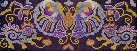 臺(tái)江苗繡的圖畫紋飾豐富,有造型獨(dú)特的飛禽走獸、花鳥魚蟲,還將人與大自然的其他動(dòng)植物在繡片上融為一體,體現(xiàn)了苗族人民對自然萬物的崇拜,同時(shí)也折射出苗族屢經(jīng)遷徙的歷史變遷。