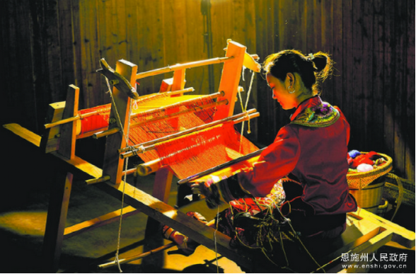 土家織錦歷史悠久,源遠(yuǎn)流長。從秦至西漢,土家先民的紡織業(yè)逐漸發(fā)展,所織的“布”已成為納貢之名品。到元明清時期,“西蘭卡普”已被稱為“土錦”“花布”,并大量用于服飾,《大明一統(tǒng)志》載:“土民喜服五色斑衣”;清同治本《來鳳縣志》也有關(guān)于“西蘭卡普”的記載:“……染各色棉紗為經(jīng)緯,斑然可愛”。