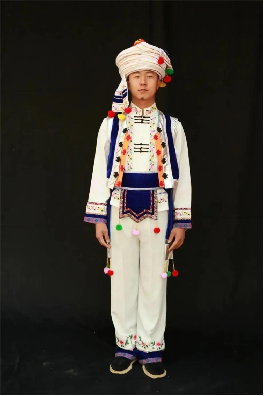 白族有著尚白的傳統(tǒng),白族男子喜纏白色或藍(lán)色包頭,多穿白色對襟上衣,外套黑領(lǐng)褂,下身穿寬筒褲,系拖須褲帶,腳穿剪刀口布鞋,有的還佩帶繡有美麗圖案的掛包,顯得敦厚英俊,灑脫大方。