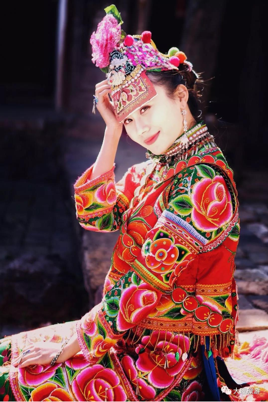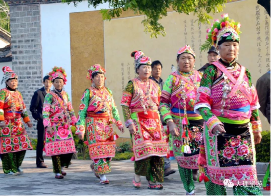 男子頭頂氈帽(又稱氈窩),穿大襟衣、大襠褲,赤足或穿草鞋,披羊皮,外出背皮袋(現(xiàn)已基本消失)。女子裹高包頭、額上飾銀桂花,衣為布襟,外套坎肩,腰系大圍腰,大圍腰左右下三邊繡五色花,為動植物圖案,足穿繡花鳳頭鞋,用本地產(chǎn)綠布條制褲子,不鎖腳邊,腰間背圓形白氈裹背,所穿服飾顏色鮮艷、質(zhì)地厚重,盡顯遠(yuǎn)古南詔皇室服飾遺風(fēng)。