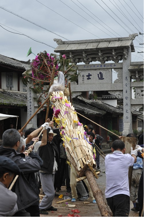 在劍川,都是由家里喜添子嗣的人家來籌備火把節(jié)的一切事宜,除了對新生兒的祝福,火把樹的裝扮也表示劍川人祈愿風(fēng)調(diào)雨順,人壽年豐、鄰里和諧?;鸢岩樱ㄩc年要扎十三層),上面六層的明子和柴分別由細到粗,一層接著一層,下面七層都是一樣的新柴。喻示每一個新的日子都紅紅火火。