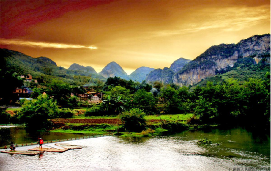 壩美,為壯語譯漢語為:壩—沖口,美—樹 ,因居住的沖口樹木多而得名。壩美村位于珠江流域西江水系馱娘江上游的阿科河畔。屬喀斯特地貌,區(qū)域內(nèi)山峰奇特,河谷幽美,阡陌縱橫,河流山泉蜿蜒奔流,溶洞層疊散布在山體峰內(nèi),冬無嚴寒,夏不酷暑,氣候宜人。因四面環(huán)山,不通公路,進出寨子主要靠村前村后兩個天然的石灰溶巖水洞,村民們要摸著巖壁趟水、撐竹筏、劃獨木舟、坐小船,經(jīng)過950米長的幽暗的“出水洞”和680米長的“湯拿洞”才能進出。由于地處偏僻,交通不便,基本不與外界交往,多年來壩美村長時期與外世隔絕。壩美村水源豐富,氣候溫和,自然生態(tài)環(huán)境未被污染,負氧離子質(zhì)數(shù)高出城市數(shù)倍,游人在此休憩,心曠神怡,是一個溫濕潤,四季宜人的旅游勝地。就生態(tài)環(huán)境和歷史淵源來說,《桃花源記》問世1500多年,只聞其名,不見其實。相傳除唐代確認湖南省桃源縣的桃源洞為其原型外,目前全國就有冠名“世外桃源”的地名16個之多。而今天的壩美,不僅十分相似,而且還神似東晉文學家陶淵明筆下所描寫的“林盡水源,便得一山。山有小口,仿佛若有光;便舍船從口入……土地平曠,屋舍儼然,有良田美池桑竹之屬;阡陌交通,雞犬相聞……”的世外桃源。而且在當?shù)卮迕裰杏性S多歷史傳說:北宋皇祐四年(公元1052年),壯族起義領(lǐng)袖儂智高在邕州(南寧)昆侖關(guān)被狄青打敗后,退入以其繼父儂夏卿為首領(lǐng)的特磨道(廣南)后,至和二年(1055年),宋朝廷又派楊文廣領(lǐng)兵進剿,儂智高在突出重圍轉(zhuǎn)至阿科(今廣南縣壩美鎮(zhèn)治所)與宋軍周旋,終因寡不敵眾而離開阿科轉(zhuǎn)戰(zhàn)于丘北、開遠、蒙自、元江等地,后到大理不知所終。