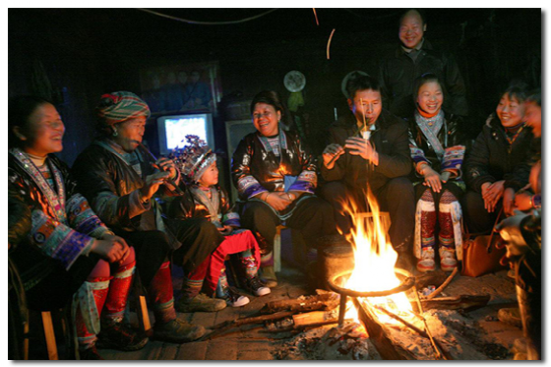 苗族起木樓很注重火塘的設(shè)置,特別留出二樓正中的大半廂作火塘?;鹛劣脤捄窭仙寄景彖傊瞥梢粋€(gè)長寬約一點(diǎn)五米,深約六十公分的正方形木槽,槽內(nèi)用粘性強(qiáng)的黃泥巴填滿舂緊,正中央安放有三腳鐵架,用于架鍋煮食?;鹛潦侵笫场⑦M(jìn)餐、取暖、會(huì)客、議事、祭祀的地方,又是年輕人走妹行歌、談情說愛、舉行婚禮儀式的場所。因此苗家人對火塘是十分看重的。