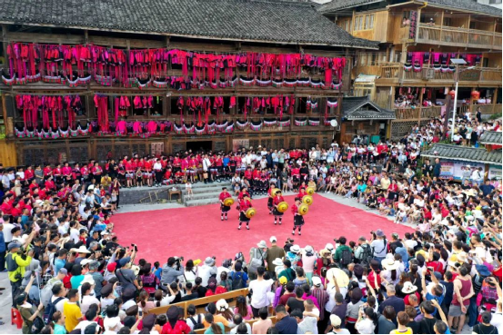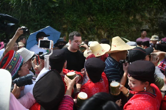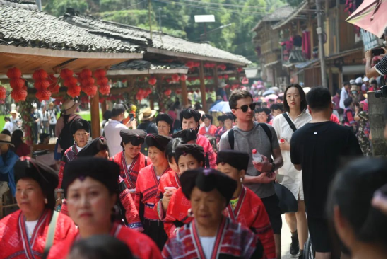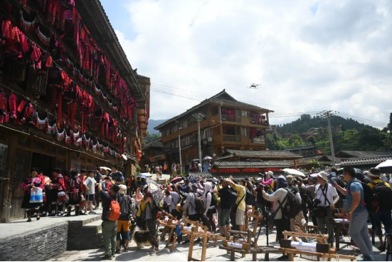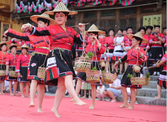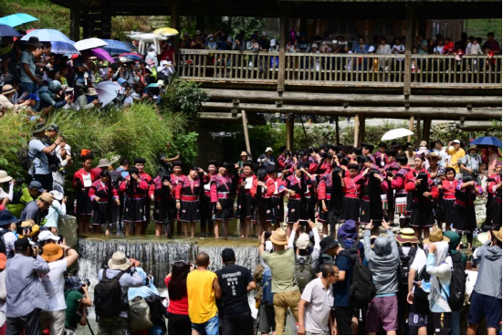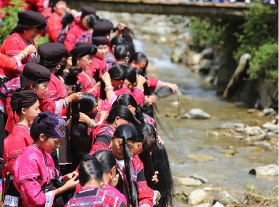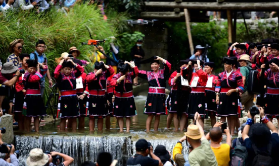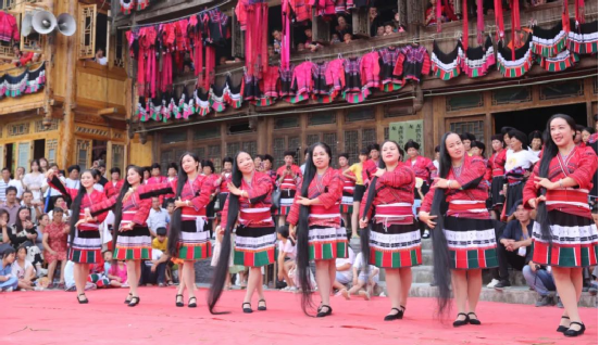 曬衣節(jié)當天還進行了嗩吶鑼鼓迎賓、瑤嫂長發(fā)梳妝展示、“抬金狗”送祝福、紅瑤服飾加工展示、紅瑤集體婚禮等活動,豐富多彩的民俗文化、濃郁的民族風(fēng)情,讓各地游客流連忘返。