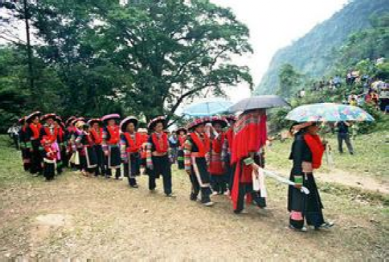 這里的"女婚男嫁"特點,大體上有這么幾個階段。當男女青年都長到18歲后,就開始講究修飾,喬裝打扮一新,女青年似花蕊朵朵,男青年個個英俊瀟灑。通過趕街、走親訪友、耍老表、節(jié)假日唱山歌,打陀螺,拋毽子等方式,進行談情說愛,互相了解,這是認識階段。在認識基礎(chǔ)上,雙方互請到家做客,彼此進一步掌握對方為人、性格,家庭成員,家庭經(jīng)濟等情況。這是加深認識、了解、建立愛慕之情階段。每逢農(nóng)忙季節(jié)和節(jié)假日,女方總要請男方來幫助犁地、耙田,耕種,收割,蓋房子等,這是考察對方勤勞能干還是好逸惡勞階段,是最關(guān)鍵的階段經(jīng)過一兩年的交往接觸,雙方產(chǎn)生了深厚感情,女方就偷偷買布,精心地打好精致的布鞋送給男方,男方收到信物后,就選擇買手鐲、頭簪、戒指,耳環(huán)或手表等其中的一兩件送給女方,彼此作為定情物,確定自己的心上人。但是,這些交往仍然是在秘密的條件下進行,屬保密階段。經(jīng)過以上四個階段以后,女方便請男方派老人帶上幾斤酒,糖,一些煙餅等禮品來訂親,要求上門,將婚事公布于眾,從這以后,女方就負責籌備一切嫁妝、床上用品、家具等。待東西備齊,女方就擇日接男方過門。