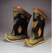 蒙古人愛穿靴子,蒙古靴分布靴和皮靴兩種。布靴多用厚布或帆布制成,穿起來柔軟、輕便。皮靴多用牛皮、馬皮或驢皮制成,結(jié)實(shí)耐用,防水抗寒性能好。其式樣大體分靴尖上卷、半卷和平底不卷的三種,分別適宜在沙漠、干旱草原和濕潤草原上行走。蒙古靴做工精細(xì)考究,靴幫、靴靿上多繡制或剪貼有精美的花紋圖案。