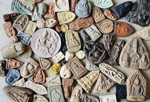 我在曼谷一家有40年歷史的佛像店“佛光工藝社”采訪時問到老專家這樣一個問題:泰國現(xiàn)在大概有多少種圖案的帕肯?所有聽到這個問題的人都是一聲驚嘆,然后笑說:“無數(shù)!”我非要問出個數(shù)來,他們便告訴我,泰國是一個歷史劃分復(fù)雜、族源廣博的國家,因此其包容性很強(qiáng),雖然九成以上的人信仰佛教,但是婆羅門教、道教、伊斯蘭教、基督教等在泰國都被接納,還有本土的一些法術(shù)也不曾被丟棄。所以,每天每個來定做的人都會有不同材質(zhì)的要求,不同圖像、符咒的組合,僅一個工藝社40年來就已經(jīng)做過幾十萬種的圖案組合。我收藏的擦擦有不同年代、不同材質(zhì)、不同價值的,除去年代久遠(yuǎn)的,頗有價值的就是一個藥擦,那是一個大威德金剛擦,專家說從被剝落的剖面看,里面有藥材的成分。我知道,在西藏,擦擦因材質(zhì)和制作人不同而有很大的區(qū)別。擦擦中最為稀有難求的一種叫“布擦”,那是寺廟僧人在保存活佛法體的時候,將那些浸透活佛法身血水的鹽巴或其它藥物和泥土融合后制成的。另一種較為珍貴的擦擦是活佛的骨灰與泥土摻混在一起制作而成的。還有一種藥物擦擦,是用不同的名貴藥材如珍珠、瑪瑙、藏紅花等藏藥合成制作,可服用治病。最普通的擦擦用一般的泥土制作,好一點(diǎn)的有膠泥、陶土、白泥等,這種擦擦成本低廉,在民間流傳最廣。