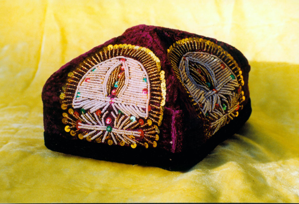 除了花帽之外,維吾爾人還喜愛(ài)戴皮帽,主要作用為在冬季保暖、抵御風(fēng)寒,多選用羊皮來(lái)進(jìn)行縫制,當(dāng)然也有用狐皮、貍皮、兔皮、旱獺皮、海獺皮、貂皮等精制的皮帽。維吾爾族皮帽種類也比較豐富,男女皆宜,主要有白吐馬克、阿圖什吐馬克、賽爾皮切吐瑪克、歐熱吐瑪克、開(kāi)木切特吐瑪克、庫(kù)拉克恰等。