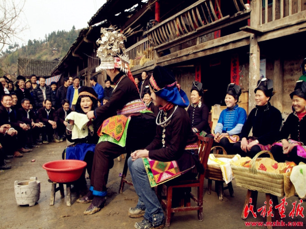 敬酒過后,新娘走上吊腳樓進(jìn)入洞房休息片刻,然后與新郎一同在樓上向前來賀喜的親友拋灑喜糖。來賓蜂擁而上爭(zhēng)搶喜糖,一片歡騰場(chǎng)面。分完喜糖,新娘來到吊腳樓前的院子里用早已準(zhǔn)備好的清水親手為婆婆擦臉,表示新媳婦對(duì)長(zhǎng)輩的尊敬與孝心。