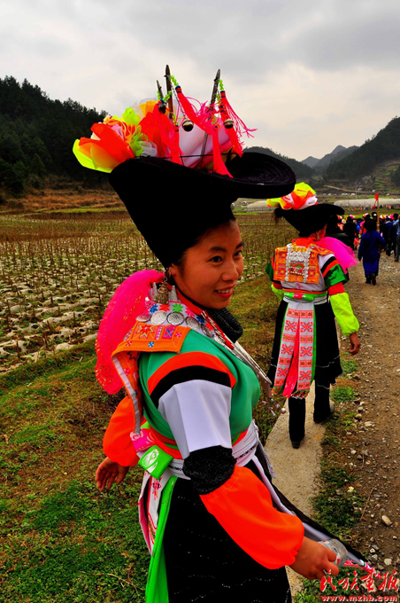 跳洞還有一項(xiàng)職能就是聯(lián)誼。正月期間,遠(yuǎn)近的苗家人都聚集在一個(gè)個(gè)有“洞”的村寨,一個(gè)“洞”跳一天舞,親戚朋友之間也借機(jī)聯(lián)絡(luò)感情。而對于苗族青年男女來說,“跳洞”則是一個(gè)相親的好機(jī)會(huì),通過跳洞相識(shí)、熟悉、相戀、成婚……杉坪村的家庭基本都是由跳洞開始而后組成的。