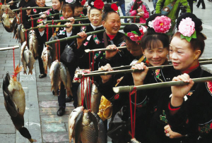 2015年11月25日,是貴州省黔東南苗族侗族自治州雷山縣苗族新年的大年初三,自11月23日至25日,貴州雷山縣大塘鎮(zhèn)、丹江鎮(zhèn)、西江鎮(zhèn)三鎮(zhèn)六苗寨的5218名姑媽、姑爹一起回娘家過苗年?!白笫忠恢浑u,右手一只鴨,身后還背著一個胖娃娃”的“回娘家”場景,在苗寨里展現(xiàn)到了極致。
