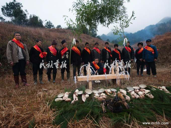 招完白虎龍后,天已大亮,這時村里人抬著一頭豬上來了,村民把龍橋龍凳做好,安放在壩子中央。接下來,儀式進入招龍程序。在龍橋龍凳的前方,擺上煮熟的豬頭、豬尾、豬腳和心肝、12坨豬肉、12碗甜酒、12碗糯米飯等祭品。12位招龍代表整整齊齊地站在龍橋龍凳的后方,燒完香紙后,由師傅開念招龍詞,把四面八方的大河小溪、大坡小坡、大嶺小嶺、大梁小梁、大橋小路、寨邊古樹的龍魂全喊到招龍場地來。傳說龍是治水的,苗族人崇拜龍,把龍招進來是為了保佑全村男女老少百年長壽,家家戶戶發(fā)子發(fā)孫,解災(zāi)脫難,風(fēng)調(diào)雨順,五谷豐登,喂牛牛大,養(yǎng)豬豬肥,養(yǎng)雞雞發(fā),順順利利,平平安安。師傅念完后,與招龍代表把12杯酒喝完,表示程序完畢。不久,全村男女老少三三兩兩都來到了山上,許多婦女帶著祭品燒香燒紙求子求孫,龍橋龍凳四周擠滿了人,香火彌漫整個山坡。