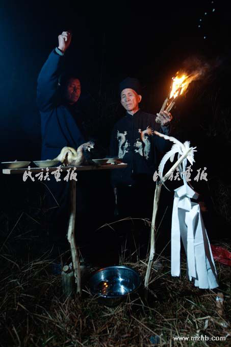 到招龍儀式活動點時,已是凌晨五點半,我們所在的位置是一個山腰,有一個小壩子。我發(fā)現(xiàn)參加儀式的只有十二三個人,就好奇地問:“為什么只來十多個人?”原來這些人是選出來的代表,該村有7個村民小組,共203戶,有980多人口,每次招龍大喜時,要從村民中推選出12位作為招龍代表,從頭到尾主持一切事務(wù)。說話間,村里人就開始忙著生火,或準備各項招龍工作。他們用木板支起一個擺放祭品的臺板,擺上祭品。接著,在招龍師傅的主持下,儀式正式開始。第一個程序是“喊白虎龍”,苗家稱為“共階夸羊捌”,師傅拿著一個白公雞,進行一番念誦后宰殺掉,等雞煮熟后再擺上祭臺。