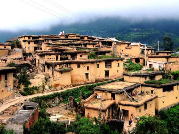 彝族是農(nóng)牧兼營(yíng)的民族,村寨的分布與坐落有其獨(dú)特的傳承。彝族的村寨多坐落在海拔2000~3000米的山區(qū)、半山區(qū),相沿聚族而居。為適應(yīng)西南地區(qū)亞熱帶氣候和山地特點(diǎn),彝民們便就地取材,以一種最容易、最節(jié)省錢(qián)財(cái)人力的建房方式,創(chuàng)造出中國(guó)建筑的獨(dú)特樣式——土掌房。土掌房多建于山地斜坡上,以石為墻基,用土坯砌墻或用土筑墻,墻上架梁,梁上鋪木板、木條或竹子,上面再鋪一層土,經(jīng)灑水抿捶,形成平臺(tái)房頂,不漏雨水。有的大梁架在木柱上,擔(dān)上墊木,鋪茅草或稻草,草上覆蓋稀泥,再放細(xì)土捶實(shí)而成。