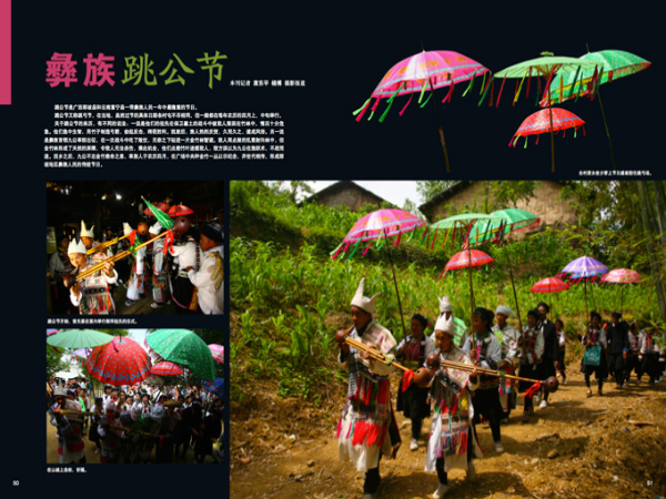 跳公節(jié)的活動以祭神和歌舞為主,內(nèi)容豐富多彩,整個節(jié)日要進行三天才能結(jié)束。過節(jié)時全村男女老少都要穿上節(jié)日盛裝,由畢摩(即巫師,彝語中有教師的含義)宣講祖先的功績,帶領(lǐng)大家祭拜,隨后是飲酒唱歌,眾人打著銅鼓,吹著葫蘆絲,圍繞金竹叢,遵循傳統(tǒng)的舞蹈步伐,由慢而快,由低潮到高潮,盡情歡慶。青年們則表演象征圍獵、殺敵的“跳閘門”、“跨斷橋”等舞蹈,表示緬懷先祖的英勇尚武精神。四周擺滿節(jié)日食品,大家可邊吃邊舞, 還不時地穿插著畢摩的念經(jīng)、祈禱、祝福等儀式,期間還要舉行賽馬和各種表演活動。天黑以后,青年男女則成群結(jié)隊到各家各戶輪流跳舞、祝福,甚至徹夜狂歡。第三天是做“三朝”,主題是祭山。村民們穿著新衣,敲著銅鼓,吹著葫蘆絲,打著花傘,在山間小路上魚貫而行。來到山坡之后,依舊是唱歌跳舞,念經(jīng)祈福,男青年則表演各種節(jié)目。祭山結(jié)束后,來參加節(jié)日活動的客人要立即離去,否則便被視為不友好。等客人走完,全村男女凡是能干活的都得于當(dāng)天下地做一門活路,表示人勤神佑,今年定將獲得好收成。