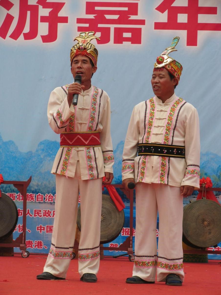 壯族傳統(tǒng)音樂主要是各種山歌曲調,是產生于古代的詩歌、音樂、舞蹈三位一體的古老聲樂藝術。在壯族地區(qū),幾乎每個鄉(xiāng)都有幾個固定的曲調,有用于敘事的平調、抒發(fā)歡快心情的喜調、平緩柔和細膩深沉的詩調,富于教誨性的卜牙(老人)調和表現哀傷悲調等。曲式有支聲式、和聲式和復調式,用于獨唱、領唱、重唱、合唱的民歌調有相應的曲式結構。其中合唱又分為二聲部和三聲部。曲藝有末倫、唱師、比余等,唱師的唱本脫胎于經詩,一般為七言句式,以一鼓一鑼過門,無伴奏。曲牌各地不一,每個地方一般由AB調,比較固定。末倫流傳于桂西南地區(qū),來源于巫調,發(fā)展成為曲藝。其詞為七言或五言,上下句式,以三弦伴奏,藝人自彈自唱,詞很優(yōu)美。內容有說故事、訴苦情、嘆離別等,可長可短,形式靈活。比余流傳于紅水河中游東蘭、鳳山一帶,詞為長短句,腰腳韻,寓言式或隱喻式,生動活潑。演唱時,藝人與聽眾互相呼應,氣氛熱烈。