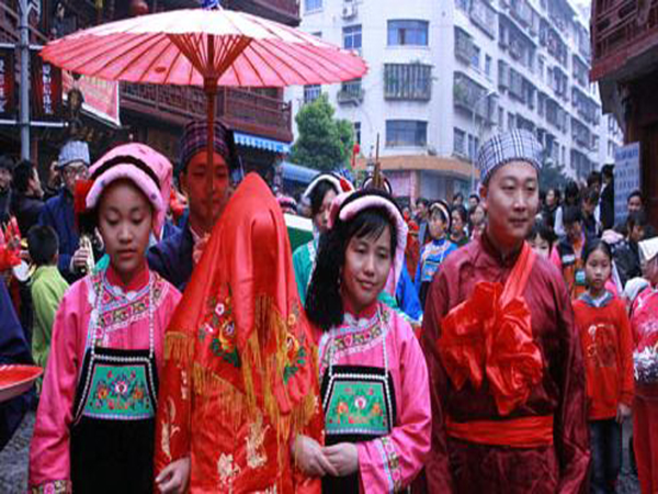 男方的“提親”得到應(yīng)允以后,雙方即開始頻繁往來,加深感情。到了可以談婚論嫁的年齡,便舉行“訂親”儀式。由男方選擇吉日,通知女方做好準(zhǔn)備。那一天,男方家請人抬著用大紅紙封口的一大壇酒、若干塊紅糖、一盤用紅紙包裝的爆竹、一只大公雞,另外還要送彩禮錢若干,其數(shù)量不同時(shí)代、不同地區(qū)有不同的慣例。訂婚儀式后,準(zhǔn)女婿每年給岳父家送一只豬腿、糯米粑及酒等禮物,以示孝敬。