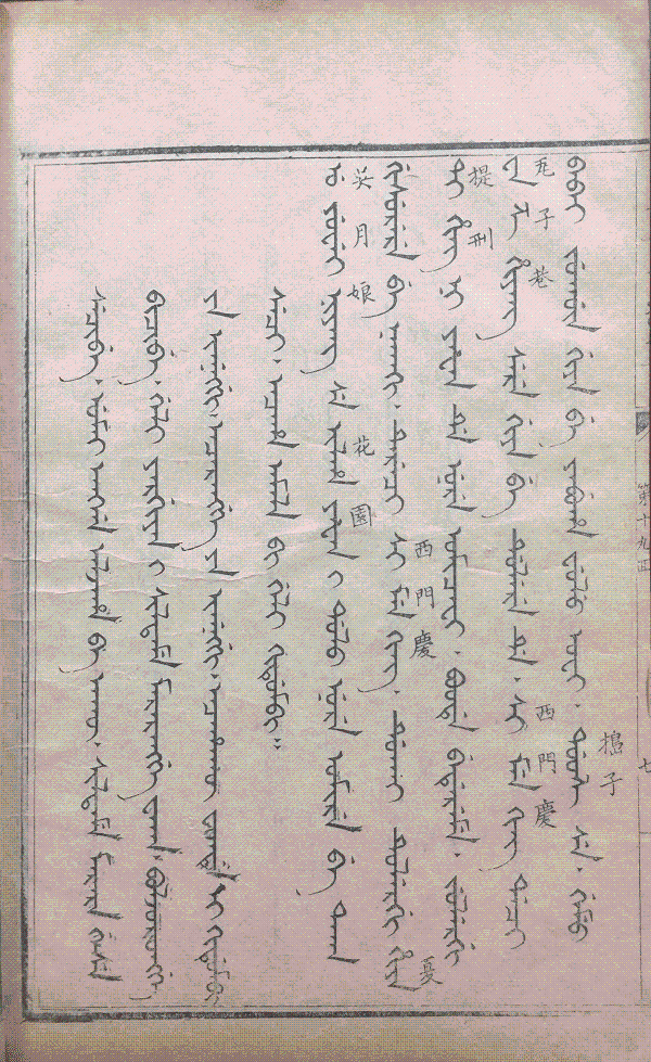 滿文本《金瓶梅》國(guó)內(nèi)藏有國(guó)家圖書(shū)館刊本、中央民族大學(xué)圖書(shū)館刊本、趙則誠(chéng)先生藏刊本(殘)、中國(guó)社科院民族研究所刊本(殘)、大連圖書(shū)館抄本、吉林大學(xué)圖書(shū)館精抄本、中國(guó)民族圖書(shū)館刻本等。此外北平闞君云敝處所藏有蒙文《金瓶梅》。