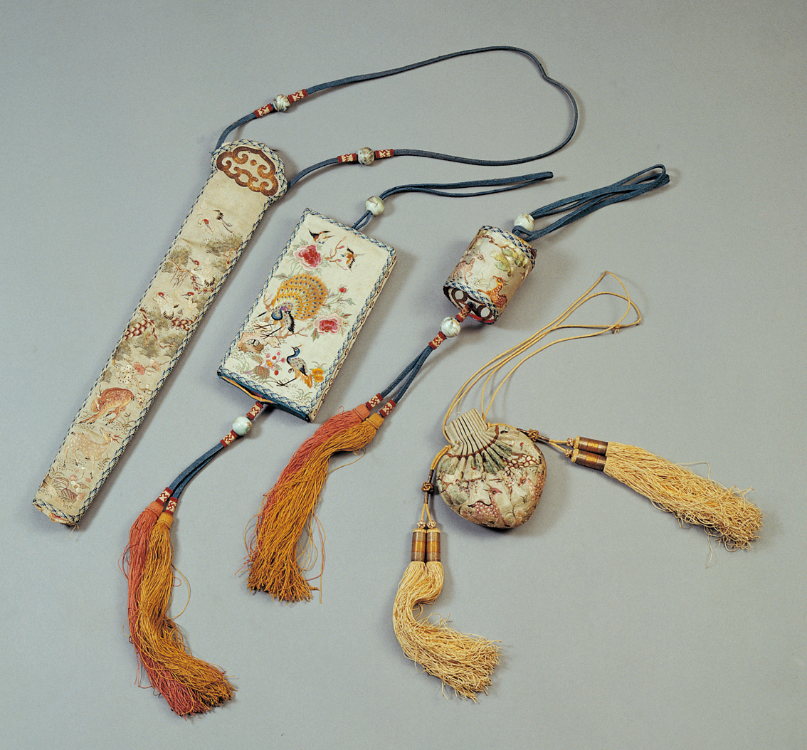 滿族服飾色彩多以淡雅的白色、藍(lán)紫色為主,紅、粉、淡黃、黑等色也是其服飾的常用色。白色在滿族服飾中是一個(gè)重要的顏色,因?yàn)?,滿族傳統(tǒng)上有尚白習(xí)俗,以白色為潔、為貴,白色象征著吉祥如意,所以,在滿族服飾中常在紅色、藍(lán)色等其他顏色的旗袍上鑲白色的花邊。滿族男女都喜愛在腰間或衣服的大襟上掛佩飾。男子有火鐮、耳勺、牙簽、眼鏡盒、扇帶。滿族女子喜歡盤頭翅,梳兩把頭或旗髻,戴耳環(huán)、手鐲、戒指、頭簪、大絨花和鬢花等各種裝飾品。擅長刺繡,她們?cè)谝陆?、鞋面、香囊、荷包、枕頭等物品上刺繡花卉、芳草、鶴鹿、龍鳳等吉祥圖案(圖為滿族清代繡花湖色緞佩飾,中央民族大學(xué)民族博物館館藏)。