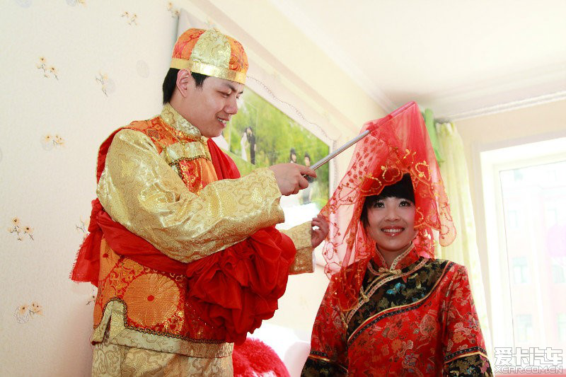 滿族傳統(tǒng)婚姻儀式較為復(fù)雜,大致經(jīng)過通媒、放定、納彩、過箱、迎親、拜堂、拜祖、分大小、回門和住對月一整套過程。通媒即由男方家請媒人向女方家求婚,兩家都同意后便放定,即男方家贈如意或釵釧諸物為定禮。然后是定婚,即選擇吉日,男方家及其親戚往女家問名,女家設(shè)宴款待,男方家長致辭求婚,女方家則推謝再三,男方家堅(jiān)持求婚,女方家同意后,才算定下婚事。此時(shí)男方要拜女方家神位及其長輩。定婚后要過禮,也是選擇吉日,男方家送衣服、綢緞、羊、鵝等禮物。男方家還要贈銀兩錢財(cái)。此時(shí)要議定婚期。進(jìn)入迎親階段,女方家在婚期前一天陪送嫁妝,俗稱“過箱”,新郎要往女家致謝。迎親時(shí),新郎在迎親隊(duì)伍的陪伴下趕著彩車迎親,在途中兩車相錯(cuò)時(shí),新娘的哥哥將新娘抱上新郎家的彩車,俗稱“插車”(由于各地滿族風(fēng)俗不同,也有新郎與迎新隊(duì)伍直接到新娘家迎親的。還有的地方有“旗俗不親迎”之說)。新娘至新郎家,換車乘轎,花轎落地,新郎要虛射三箭。新娘蒙紅蓋頭下轎,與新郎站在事先擺在院中的天地桌前,向北三叩首,俗稱拜北斗,即拜天地。拜完后撤天地桌,新娘進(jìn)入臨時(shí)搭的帳篷,謂之坐帳(也稱“坐?!保?。坐帳時(shí)“開臉”,換頭型。坐帳后,新娘跨過馬鞍進(jìn)洞房,新郎用秤桿揭去蓋頭扔到房檐上。晚間在地上放一桌子,桌上放兩個(gè)酒壺和酒盅,新郎新娘手挽手,繞桌子三圈后飲交杯酒,吃“合喜面”“子孫餑餑”,眾人鬧洞房,唱喜歌,名曰“拉空家”(或有人用黑豆往新房窗戶上撒,熱鬧一兩個(gè)小時(shí)后自散)?;閼c當(dāng)晚,新郎新娘當(dāng)然要拜祖宗,炕上點(diǎn)燃一對蠟燭,通宵不熄?;楹蟮谝惶欤履锝o夫家親戚裝煙敬茶,拜宗族,認(rèn)明輩分,謂之“分大小”。三日后新郎新娘回娘家,拜見娘家人并拜祖宗?;楹笠粋€(gè)月,新娘回娘家住一個(gè)月,謂之“住對月”。至此,婚娶儀禮乃告結(jié)束(下圖引自廣西汽車論壇)。