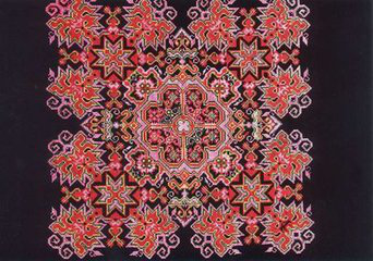 侗族刺繡工藝流行于湘、桂、黔三省交界處的侗族聚居區(qū)。圖案紋樣多取材于自然景物,如花、鳥(niǎo)、魚、蟲之類。畫面生動(dòng)活潑,色彩明麗。