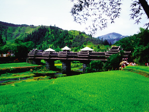 程陽永濟橋始建于民國初年,集橋、亭、閣、樓、臺于一身。橋墩石塊砌成六面柱體,墩上設(shè)兩層原木托架梁,托架上建有5座塔閣式橋亭和19間橋廊。橋廊為木結(jié)構(gòu),上覆琉璃泥瓦,對稱分布,中間為六角攢頭重檐亭。整座橋和諧得體,如游龍翹首,鳳凰展翅。它與我國的趙州石拱橋、瀘定鐵索橋、羅馬尼亞鋼梁諾瓦沃橋并稱為世界四大歷史名橋。