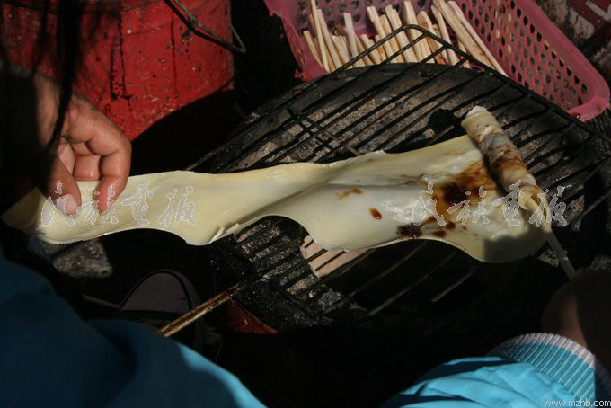 街邊小攤上的烤乳扇,風(fēng)味別具一格,烤的時候要涂抹玫瑰糖