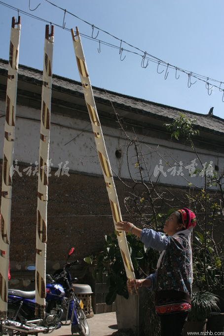 準(zhǔn)備好原料,就可以制作乳扇了。先在鍋內(nèi)加入半勺酸水,加溫至70°C左右,將三碗 新鮮的牛奶舀入鍋中,加熱后的牛奶在酸的作用下會分離成絮狀。此時需迅速攪拌,使乳清蛋白凝固成塊。接著就是制作乳扇的關(guān)鍵了, 王紅杏說,這可是個技術(shù)活兒。只見她用竹筷將鍋中的凝乳夾出,揉成餅狀,將軟軟的富有彈性的凝乳一端卷在筷子上,并快速抻拉,同時,將扯長的凝乳用手撐開,使其變?yōu)楸∑瑺?最后將扯好的薄片繞在旁邊的竹竿架上。這樣,乳扇的 雛形就制作完成了。待一個架子上纏滿了幾組乳扇后,將竹桿架拿到室外掛好,在太陽下晾曬幾日,晾干后取下,乳扇就算做好了。