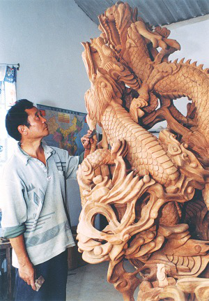 今年54歲的李元生,以雕龍而遠(yuǎn)近聞名。早在上個(gè)世紀(jì)80年代初,他創(chuàng)作的第一件根(木)雕作品《困龍也有上天時(shí)》,便被一位游客購(gòu)買(mǎi)收藏。在近20年的時(shí)間里,一些常人眼里只能當(dāng)柴燒的樹(shù)根,在他獨(dú)特的構(gòu)思和飛舞的刻刀中,變成了上百件大小不一的富有生命力的根(木)雕作品。其中的代表作有:《九龍傳說(shuō)》、《送子觀音》、《長(zhǎng)壽九千年》、《金龍獻(xiàn)寶》、《哪吒鬧?!贰ⅰ叮保梗梗埂伺c自然》等。這些作品,不少被省內(nèi)外的單位和個(gè)人作為珍品收藏。