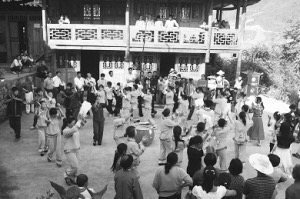 從古至今,每年的正月初九“舍巴節(jié)”(舍巴:土家語(yǔ)擺手舞的意思)、三月三“祭祖節(jié)”、“冬至?xí)?,土家人都要在擺手堂舉行盛大的祭祀活動(dòng)。農(nóng)閑時(shí)的夜晚,在農(nóng)家院壩,點(diǎn)燃熊熊篝火,男女老少在有奏的鑼鼓聲中歡快地舞蹈,盡情地歌唱。清代文人彭施鐸在《竹枝詞》中載:“福石城中錦作窩,土王宮前水生波,紅燈萬(wàn)盞人千疊,一片纏綿擺手歌?!绷攘葦?shù)語(yǔ)把土家人跳擺手舞的盛況真實(shí)地展現(xiàn)出來(lái)。