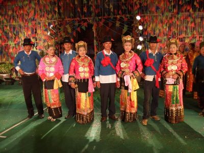 儀式開始時,主婚人端坐在“茂歡”后的正中位置,長者圍桌而坐,一對新人按男右女左的位置面對主婚人而跪,親友圍于兩旁。坐在“茂歡”跟前的人伸出右手搭在桌上,靜聽主婚人念誦祝詞。主婚人揭去蓋在食物上的葉帽,先為新郎、新娘祝福:“今天是個美好、吉祥的日子,現(xiàn)在是一天中最好的時辰,你倆恩恩愛愛結(jié)成夫妻,金鳳與銅鳳結(jié)成一對,日子會幸福美好,愿生子會得子,盼生女會得女,祝福你們幸福美滿,永不離分。”