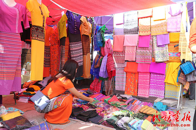 慶典活動上人潮涌動,氛圍隆重。位于文化廣場的演出中心區(qū),傣族情歌對唱、孔雀舞表演、傣拳武術(shù)表演、傣劇等節(jié)目輪番上臺。在舞臺四周,一座座簡易搭建的攤位前,賣有傣族服飾、貨品、傣文書籍等。街道兩旁的小吃一條街,擺有竹筒粑粑、撒撇、楂子、地瓜等特色美食。