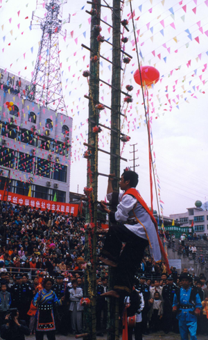 節(jié)日里,婦女們穿著鑲花邊的黑色上衣和點(diǎn)綴著各種銀飾物的花裙,佩戴耳環(huán)、項(xiàng)鏈等首飾,風(fēng)采奪人。男人穿著麻布短衣褲,腰系紅黃長(zhǎng)帶,小腿系吊簡(jiǎn),腰佩長(zhǎng)刀,肩挎箭包,英姿勃勃。節(jié)目的廣場(chǎng)上,堅(jiān)趄兩根二十米高的樹干,四周用藤蔓拉緊固定,樹桿上插有三十六把明晃晃的長(zhǎng)刀,作為向上攀登的橫檔,刀刃向上,寒光逼人,謂之“刀竿午間。鞭炮齊鳴,鑼鼓震天”。身穿大紅抱、頭纏紅布包頭、赤腳的五名“玩火者”,齊涌至竿下,圍繞刀竿唱歌跳舞,將斟滿的白酒一飲而盡,縱身飛上刀竿。雙手緊提刀面,運(yùn)足氣的腳掌斜置在鋒利的刀刃上,勇敢、靈巧地向上攀登。全場(chǎng)鴉雀無聲,大家屏住呼吸仰面觀看,對(duì)他們的氣功絕技贊嘆不已。噼噼啪啪的鞭炮聲來自竿頂優(yōu)勝者,響徹云霄。全場(chǎng)歡呼跳躍,爭(zhēng)相向爬桿者敬獻(xiàn)美酒。對(duì)歌、跳舞、蕩秋千活動(dòng)為節(jié)日增添了濃郁的氣氛。丟煙包(煙盒)活動(dòng)別具一格,青年男女各站一方,互擲煙包,姑娘將小伙的煙包收藏起來,說明姑娘接受了小伙子的愛慕。