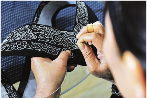 第三步是繪制圖案,即在做好的布殼上繪畫出刺繡所參照的圖案,這是制作馬尾繡的關(guān)鍵環(huán)節(jié)。其花樣繁多,精細而復(fù)雜,繪畫的好壞直接影響到馬尾繡的精美程度。