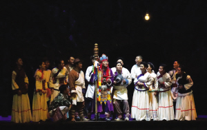 話劇《巴交龍布》由著名導(dǎo)演查麗芳擔(dān)綱總導(dǎo)演。為了實(shí)現(xiàn)戲劇擅長(zhǎng)的表達(dá)方式,該劇把與巴交龍布同行的騾子作了擬人化處理,將這對(duì)“難兄難弟”的經(jīng)歷作為貫穿全劇的一條主情節(jié)線。在雙方的對(duì)話交鋒中,既有喜劇的幽默,又有正劇的嚴(yán)肅。同時(shí),納西族傳統(tǒng)文化也得到了豐富的體現(xiàn)。劇中,不僅有盛大的納西族婚禮、神圣的東巴祭祀儀式、歡快的納西族歌舞,還有對(duì)納西族信守承諾、吃苦奉獻(xiàn)等民族精神的彰顯。
