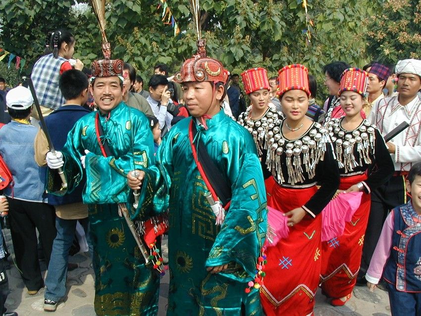 目瑙節(jié):又稱“總戈”,景頗語音譯,意思是“大伙跳舞”。目瑙節(jié)是景頗族最盛大的傳統(tǒng)節(jié)日,一般于每年農(nóng)歷正月十五以后的九天內(nèi)擇雙日舉行,節(jié)期三至五天不等。目瑙作為一種大型的群眾性歌舞活動(dòng),由來已久,歷史上,每逢豐年,出征、凱旋、婚姻嫁娶、敬祭鬼神等重要活動(dòng),均要跳“目瑙”。景頗族的“目瑙縱歌”原來是一種融宗教和文化習(xí)俗為一體的傳統(tǒng)慶典。隨著社會(huì)的發(fā)展,逐漸演化為各種不同類別的“目瑙”。大致有以下幾種:①“歲目瑙”,家庭財(cái)源茂盛,人丁興旺時(shí)舉行;②“布當(dāng)目瑙”,征戰(zhàn)取得勝利時(shí)舉行;③“貢冉目瑙”,同胞兄弟分家自立門戶時(shí)舉行;④“騰肯目瑙”,新建房屋住所落成時(shí)舉行;⑤“空然目瑙”貴族家娶親辦婚禮時(shí)舉行;⑥“達(dá)如目瑙”,出征時(shí)舉行;⑦“昔目瑙”,有名望的長者去世送葬時(shí)舉行;⑧“柱目瑙”,祭奠“木代”神時(shí)舉行。不同類別的“目瑙”都有特定的內(nèi)容和表現(xiàn)形式,但有一個(gè)共同點(diǎn)就是整個(gè)過程都是由“瑙雙”(領(lǐng)舞)隊(duì)和“瑙巴”(表演)隊(duì)組成的舞隊(duì)來表現(xiàn)和完成的。每逢目瑙節(jié)日,村村寨寨的景頗人身著節(jié)日盛裝,紛紛從四面八方涌入目瑙廣場。廣場上人山人海,氣氛熱烈歡快而不失莊嚴(yán)古樸的特色。廣場中央高豎著四根長約4米的目瑙柱,亦稱雌雄柱,中間兩根為陰,外面兩根為陽,上面皆繪有精美而富有象征意義的圖案:右邊柱上往往繪以蕨菜花紋,象征團(tuán)結(jié)奮進(jìn);左邊常畫回紋構(gòu)成若干個(gè)四方形,并涂以不同顏色,表示景頗族的遷徙路線;中間兩根柱子之間,交叉著兩把長刀,為景頗民族驍勇強(qiáng)悍、堅(jiān)強(qiáng)剛毅性格的具體標(biāo)志。目瑙柱的左側(cè)立著一個(gè)方形架子,上層是吹嗩吶的座位;前面掛著一個(gè)兩米長的大皮鼓和一面直徑一米多的大芒鑼,供跳舞時(shí)伴奏用。廣場四周用竹籬笆圍起,目的是為了防止野鬼的侵入和牲畜的干擾。舞蹈開始時(shí),鼓樂齊鳴,由兩位德高望重且又熟悉目瑙舞路線的老人身穿大龍袍,頭戴飾有孔雀、野雞羽毛和野豬牙齒的目腦帽,手持長刀領(lǐng)頭,后面跟著背銅炮和持長刀的隊(duì)伍,婦女們拿著扇子或彩帕跟在最后,邊歌邊舞,熱鬧非凡。參舞者少則百多人,多則幾千人,從清晨到日暮,以日暮到清晨,通宵達(dá)旦,其間舞者跳累時(shí)可自動(dòng)退場小歇片刻,然后繼續(xù)登場舞蹈?!澳胯Эv歌”作為一個(gè)民族的傳統(tǒng)活動(dòng)發(fā)展至今,宗教色彩和類別已日益淡化,它已成為景頗族約定俗成的傳統(tǒng)節(jié)日,統(tǒng)稱為“統(tǒng)肯(傳統(tǒng))目瑙”并賦予了新的內(nèi)涵,其內(nèi)容和形式都是展示一個(gè)民族的傳統(tǒng)文化,反映今天的新生活和對未來的美好向往。
