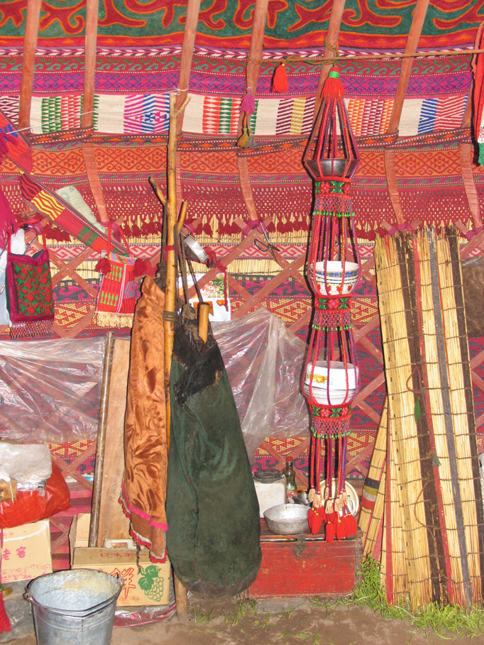 氈房文化博大精深,氈房在柯爾克孜族人的心目中不僅是一處居所,更是安定與家庭的象征,所以柯爾克孜人會傾盡所有來修飾自己的氈房,心靈手巧的柯爾克孜族婦女更是發(fā)揮聰明才智,將氈房修飾得精美絕倫。她們會在氈房外的白氈子上、天窗氈蓋以及門框周圍左右對稱地繡上柯爾克孜族傳統(tǒng)的花紋圖案,從遠處望去,柯爾克孜氈房潔白大器、精致絕倫。更美妙的是氈房內部的裝飾,氈房內在柯爾克孜族精美的手工藝刺繡的裝飾下富麗堂皇、雍容美觀,高高垂下的繡花錦帶,四周精美的民族掛毯,以及鋪設在整個氈房底部的花紋地毯,仿佛就像一座博物館一般,向人訴說著柯爾克孜族悠久的歷史和燦爛的文化。